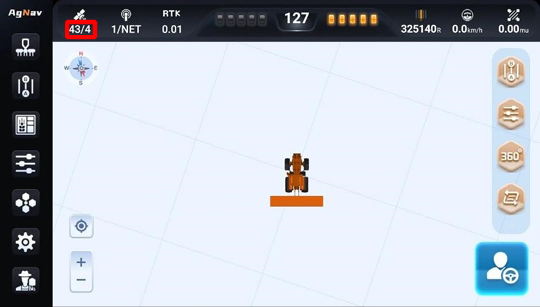 Palaa takaisin aloitusnäyttöön. Tilapalkista voit tarkistaa yhteyden tilan. Kun paikannus saavuttaa “Fix” tilan, näkyy tilapalkissa satelliitien lukumäärä (esimerkki kuvassa 43 kpl) sekä numero 4, joka tarkoittaa että laite on päässyt “Fix” tilaan ja on RTK tarkka: